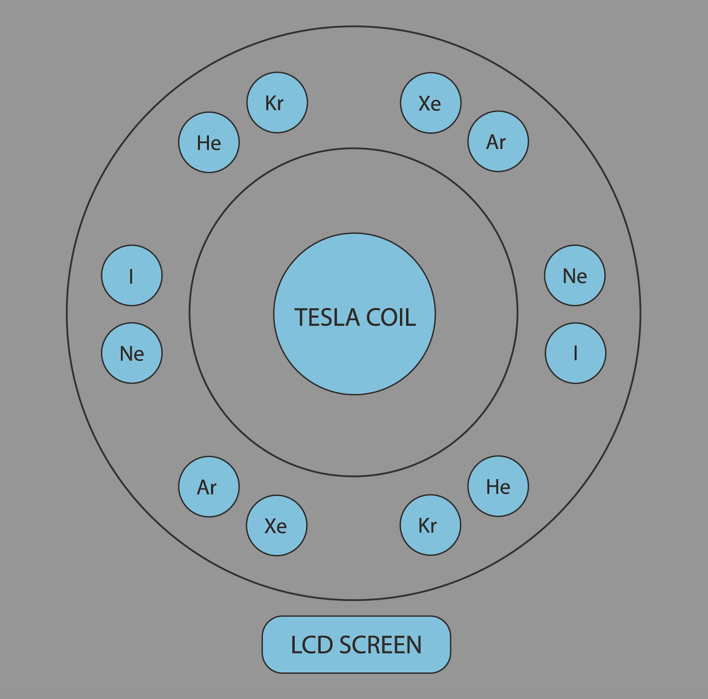 Spectrum Tube Placement The provided spectrum tube set consists of two sets of six tubes. We recommend that they be placed in a mirrored configuration. For your reference, the abbreviations are as follows:Ar He Kr Ne Xe Iargon helium krypton neon xenon iodine